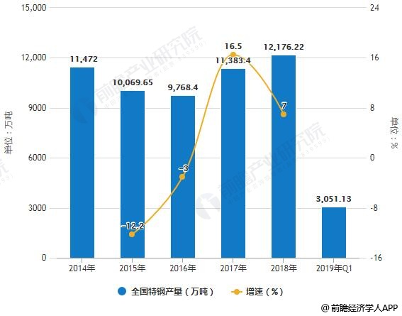 在新材料与钢铁产业政策的共同支持下,2014-2018年我国特钢产量整体呈上升趋势。据前瞻产业研究院发布的《中国特钢行业市场前瞻与投资战略规划分析报告》统计数据显示,2014年全国特钢产量已达11472万吨,2015、2016年全国特钢产量处于下降期,2016年全国特钢产量更是跌破亿吨。截止至2018年全国特钢产量达到了12176.22万吨,较上年同比增长7.0%。进入2019年一季度,全国特钢产量突破3000万吨,达到3051.13万吨。