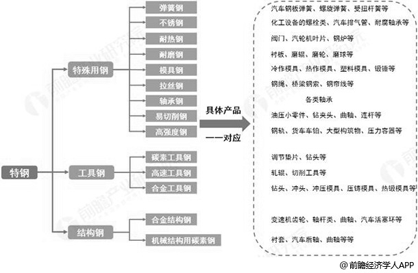 特殊钢产品种类丰富,按用途分为工具钢、结构钢与特殊用途钢三大类,其中特殊用途钢包括弹簧钢、轴承钢、不锈钢、高强度钢、耐热钢等。