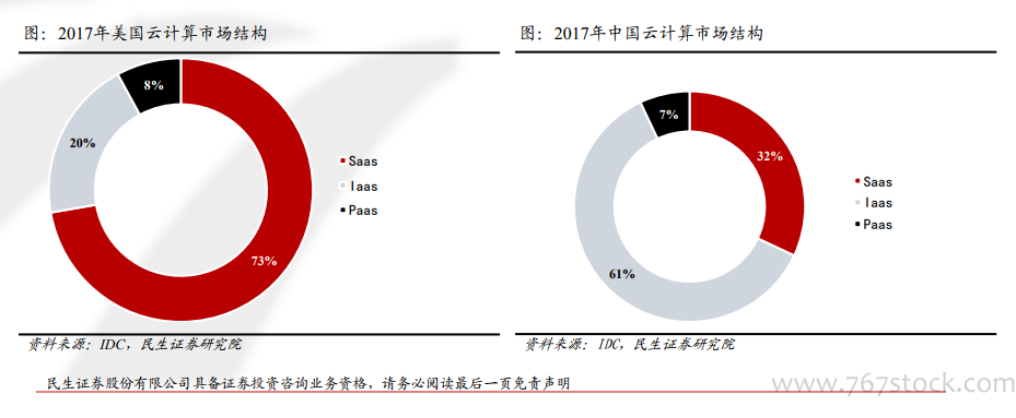 美国云计算市场以SaaS为主,中国云计算市场以IaaS为主。根据 Gartner,2017 年美国云计算市场占据全球 59.3%的市场份额,中国占据 6.2%的市场份额,中美之间云计算整体市场规模存在约 10 倍的差距。美国相对更发达的云计算市场,对于产品标准化程度高,使用范围更广的SaaS发展更为迅速,美国SaaS细分行业出现较多龙头。而中国云计算市场正在高速成长期,对于需要有大规模资金投入的IaaS,行业集中度较高,有较高的壁垒和护城河,巨头更愿意早期投入IaaS,所以中国云计算市场现在以IaaS为主。