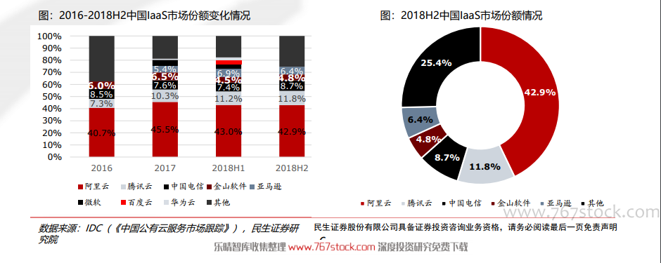 云计算产业逐渐兴起,云服务的需求与云技术的进步两方面构成产业兴起的双重驱动。需求方面:移动互联网和物联网产生的数据量越来越大、数据维度越来越多,而数据也越来越受到重视,这导致计算量急剧增长且弹性变大;技术方面:Web2.0 和 HTML5 先后撑起了前端应用(SaaS);芯片技术、虚拟化技术等托起了底层架构(IaaS);Hadoop、Spark 等大数据工程以及机器学习、深度学习撑起了中间层(PaaS)的数据处理。云服务按部署模式可分为公有云、私有云、社区云和混合云。IDC对中国公有云市场数据进行统计,2015-2018年阿里云一直位居中国云市场第一的位置,份额占比从2016年40.7%,提升到2018年的42.9%,云服务绝对值从2016年30.19亿元,提升到2018年247.02亿元;此外,中国公有云IaaS市场领域集中度较高,TOP5份额从2016年62.5%提升到2018下半年的74.6%。从IaaS市场份额来看,2018下半年,阿里云、腾讯云、中国电信、AWS、金山云分别以42.9%、11.8%、8.7%、6.4%、4.8%占据前五名。