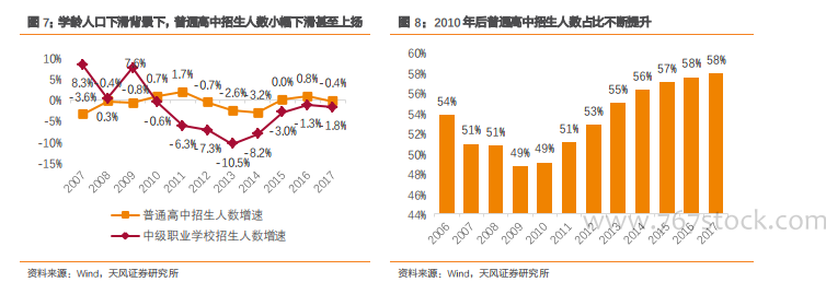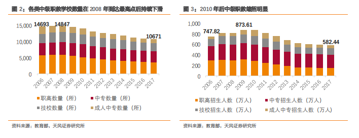 职高、成人中专平均招生规模、平均在校人数不容乐观。2010 年后,即便在院校数量下滑的基础上,中等职业教育院校整体校均招生人数仍呈现下降趋势,招生难的问题进一步凸显。受招生人数下滑的拖累,校均在校人数在两年后(即 2012 年)也开始呈现下滑态势。2017 年,校均招生人数为 546 人/校(低于普通高中的 588 人/校),校均在校人数为1492 人/校(低于普通高中的 1746 人/校)。在四类中等职业教育院校中,职高和成人中专所面临的挑战更为严峻,2010-2017 年校均招生人数 CAGR 分别为-3.7%、-5.1%,校均在校人数 CAGR 分别为-2.8%、-2.4%。2017 年,职高、中专、技校、成人中专校均在校人数分别为 1145、2131、1358、1045 人/校,其中职高、成人中专低于《中等职业学校设置标准》所规定的 1200 人/校,职业高中课程偏重理论知识,在实际技能培养方面不及技校、中专有针对性,适应就业市场,此或为其在中等职教发展退潮期首当其冲的主要原因。