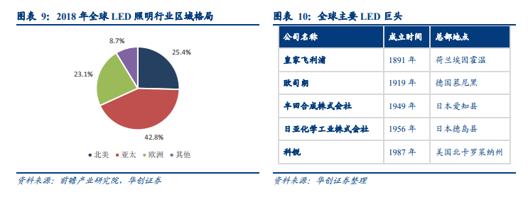 LED 照明产业广泛分布在北美、亚洲、欧洲地区。分层次看,西欧、日本、美国领先全球,深耕技术研发,占据行业制高点,欧洲有欧司朗、飞利浦这样的照明行业百年巨头,日本以日亚化学为首的科技企业在 LED 行业领先全球;亚洲其他国家也积极跟进,中国与韩国构成全球LED产业的第二梯队,这个阵营的厂家拥有消费类电子完整产业链,关注消费类电子产品背光用 LED,其技术与顶尖企业有一定差距,尤其是在通用照明领域。中国大陆等亚洲地区依托经济增长和人口优势,充分利用广大的市场,提高研发能力,加速产业扩张,已成为全球 LED 产业的新兴势力。
