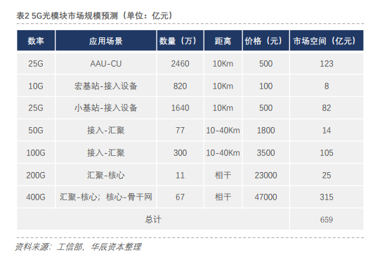 5G光模块市场规模预测。随着有线宽带和移动宽带用户的持续增长,尤其随着有线家庭宽带普及率提升及户均带宽向100Mb/s、1Gb/s升级,以及未来5G的发展,将会进一步推动运营商开展城域网、骨干网的扩容与升级。因此,高速光器件/光模块即将迎来新一轮的高速增长周期,并且光模块与光芯片的国产化替代将会加速。