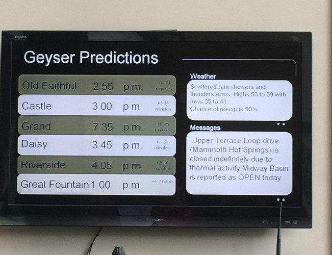 C: 其他可预测的几个间隙喷泉。 由于功课没做足,我竟然只知道老忠实。当时在老忠实安排了吃午饭,然后看喷发,之后在附近的“geyser hill”步道上走了一圈,老忠实片区地图西北一线的步道trail or walkway 因为行程比较紧张,没有预留时间去探寻。 这是网上介绍的:世界上近60%的间歇泉在黄石,黄石公园内最多的间歇泉在老忠实区的上间歇泉盆地,在其1平方英里的面积内,有150余处这种脆弱的地热奇观。在这个巨大的数字内,人们只掌握了5个主要的间歇泉的喷发规律,他们是城堡间歇泉(Castle),大间歇泉(Grand),河边间歇泉(Riverside),雏菊间歇泉(Daisy),和老忠实间歇泉(Old Faithful)。这个盆地还有些奇异的常喷发的小间歇泉、大量的温泉和一个新近出现的热泥泉。 游客中心张贴的这几个间隙泉当日最近喷发时间预测: