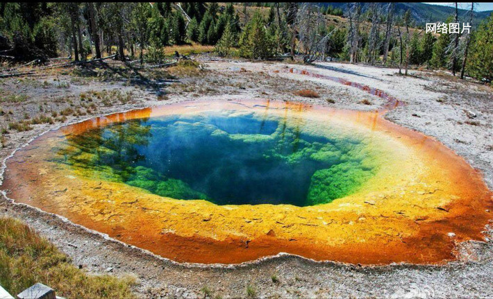 黄石公园官网老忠实地区简易地图: http://www.yellowstonenationalpark.com/uppergeyser.htm 黄石公园官网关于间隙泉的链接,可以查到上面这几个间隙泉的介绍: http://www.yellowstonenationalpark.com/uppergeyser.htm D:老忠实区的步道 trail or walkway 总长25.7公里(见上图左下角,包括 upper geyser 上间隙泉盆地、 老忠实区域,black sand 黑沙盆地 和biscuit 饼干盆地),要看完所有点几乎是不可能的,且会有大同小异的感觉。同时,热气中含有硫化氢、二氧化碳、一氧化碳等物质,混合成的臭鸡蛋味对鼻子的长时间刺激也容易引起不适,建议有选择性的徒步。 E. 不要错过牵牛花池(Morning Golory Pool)!呜呜,功课没做好,这里没去!下图是网络图片 。路线如前图,从老忠实到牵牛花池比较远,往返单程4.4公里。