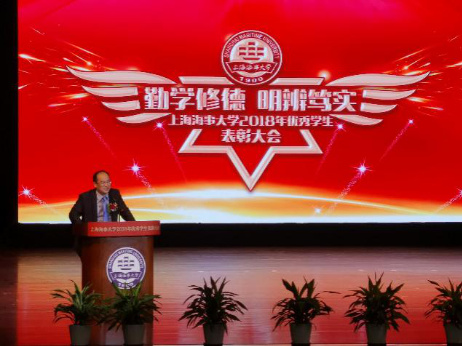 精彩的开场表演之后,表彰大会正式拉开帷幕。首先,上海海事大学党委书记金永兴老师上台致辞。金书记首先代表上海海事大学向获得各类各级奖学金和各类各级称号的学生表示热烈祝贺,向支持学校发展的企事业领导和各位嘉宾表示衷心感谢和崇高的敬意。他讲到, 优秀学生自身坚强的意志和可贵的品质,使他们在竞争中脱颖而出,走上了领奖台。愿他们志存高远,把荣誉化作为今后学习工作的动力,为人生开拓广阔的天地。