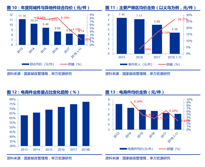 电商件占比的提升以及收费标准的降低是行业均价连年下滑的主要原因。考虑到快递公司主要从事国内快递业务,我们以同城件与异地件综合均价来刻画行业末端价格的变化情况。2017 年同城件与异地件综合均价为 8.28 元,相较 2013 年下降幅度高达 25.8%。大幅下降主要两个原因:一是电商件均价大幅下滑,从 2013 年的 8.12 元下滑至 2017 年的 6.31 元;二是电商件占比大幅提升,2013-2018 年占比提升超过了 10 个百分点。