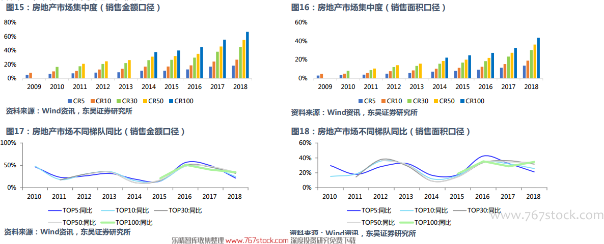 我国地产行业市场集中度加速攀升。戔止到2018年,TOP5的房企市占率提升至18%, TOP10的市占率提升至27%,TOP30的市占率提升至45%,如今市场销售有67%的份额来自TOP100。龙头房企凭借着大量的优质土地储备、更强的融资能力以及高效的运营能力,实现销售持续增长,幵由此带劢行业集中度迚一步提升。