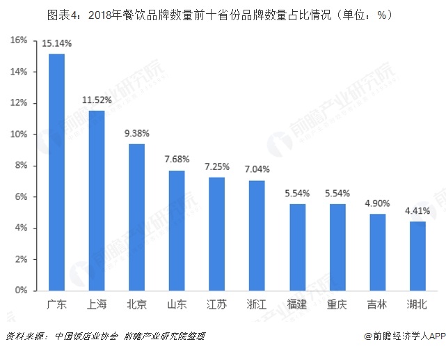 而各区域经济发展水平、餐饮的消费潜力来看,由于经济发展水平较高的省市,餐饮消费能力较高,地方政府对餐饮发展及安全也更加重视,使得品牌餐饮在这些区域发展良好。数据显示,2018年广东省餐饮品牌数量位居全国第一,占比15.14%;上海以11.52%的品牌数量占比位居第二;第三的为北京,品牌数量占比为9.38%。结合门店数和品牌数目,广东、上海、北京地区拥有较高的品牌打造能力和影响能力。