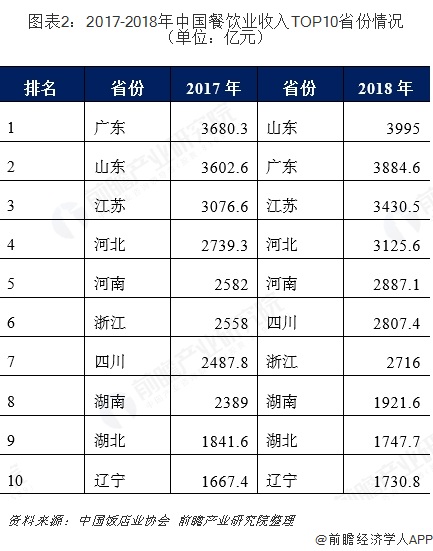 中国餐饮消费区域较为集中 2018年TOP10省份合计占比66.1%