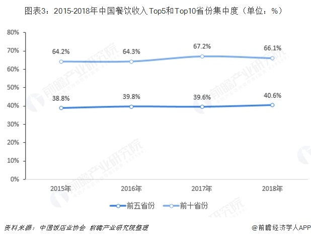 得益于国家扩大内需消费政策,以及地方政府对餐饮业发展的高度重视。我国餐饮业区域集中度较高,重点省份在全国餐饮业中发挥着举足轻重的作用。2018年前五省份餐饮收入合计占比40.6%,前十省份餐饮收入合计占比66.1%,在全国餐饮业中发挥着举足轻重的作用。
