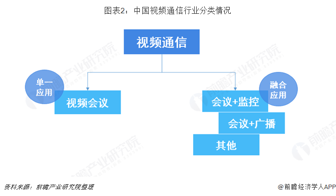 中国视频通信市场主要由视频会议和视频融合构成。视频会议可以使不同地点的用户实现即时的沟通;视频融合覆盖的应用范围较广,可以将不同制式、不同来源的多个视频资源统一整合并接入单一平台进行管理、调度、运营及其他应用操作。其通常在视频会议应用基础上,融合监控、广播等其他视频传输功能,也可以应用于政府的智慧城市运营、应急指挥、舆情监控和企业的协同商业管理等方面。