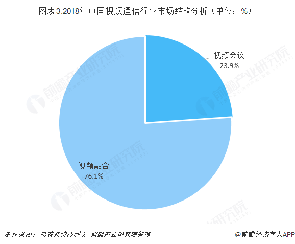 根据Frost&Sullivan统计,2018年我国视频通信市场中,视频融合市场与视频会议市场占比分别为76.1%、23.9%,可以看出视频融合为最主要的视频应用。