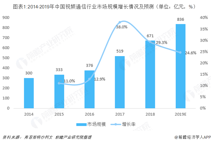 随着我国信息化进程的逐步深入,高清、实时视频通信需求的增长,以及社会治安综合治理等政府项目的推进,我国视频通信市场保持着快速发展的趋势。根据Frost&Sullivan统计,2018年我国视频通信行业市场规模达到670亿元,同比增长29.3%。预计2019年我国视频通信行业市场规模将达到836亿元。
