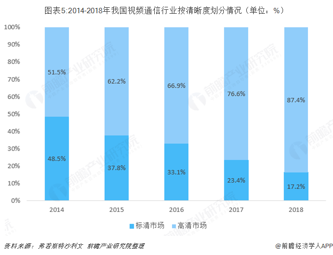 高清化一方面给视频会议带来了更好的体验,一方面能够更好得满足视频融合的需求。近年来我国高清通信市场规模在政策红利的推动下迅速扩大,2014年我国高清市场规模比例超过表情市场,达到51.5%,标志着我国视频通信市场进入高清时代。到2018年,我国高清市场规模占整个视频通信市场规模的比例达到了82.8%。
