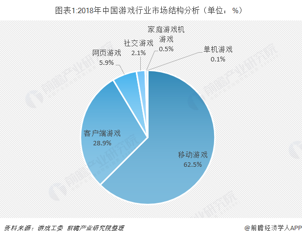 2018年我国游戏市场中,移动游戏市场实际销售收入为1339.6亿元,占比为62.5%;客户端游戏市场实际销售收入为619.6亿元,占比28.9%;网页游戏市场实际销售收入126.5亿元,占比5.9%;家庭游戏机游戏市场实际销售收入10.5亿元,占比0.5%。