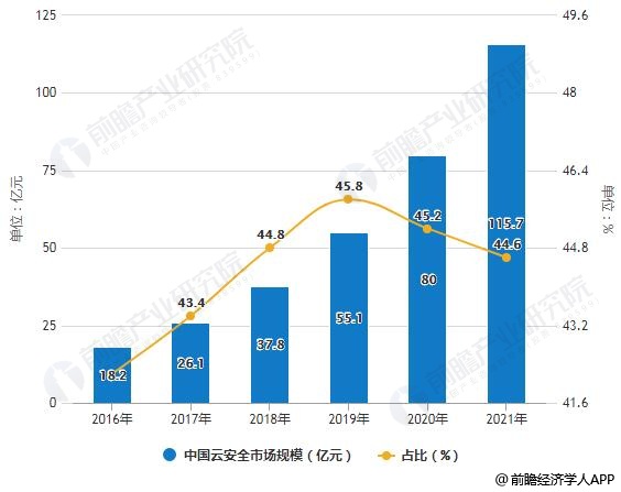我国云计算在技术方面逐渐走向成熟,步入产业发展繁荣期。云计算的进步带动无服务器计算发展,将引发新的网络信息安全问题。攻击者更容易借无服务器计算隐藏活动踪迹制造网络威胁。这些威胁同时也将为未来云安全与服务的研发与部署提供广阔的应用场景。虽然中国云安全市场目前处于起步阶段,但整体市场规模将随着云计算市场规模的增长而快速崛起。2018年中国云安全市场规模达到37.8亿元,同比增长44.8%,未来3年预计将继续保持每年40%以上的高速增长。