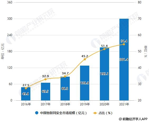 2016-2021年中国物联网安全市场规模统计及增长情况预测