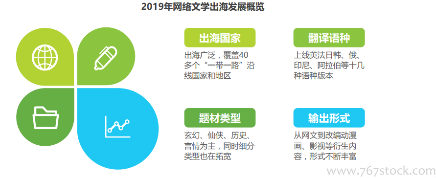 筑梦一带一路,行业发展如火如荼。网络文学企业从依赖海外翻译网站转变为自建海外网站,提供优质内容和服务,并主动扩建翻译团队,遴选优质译者,强力提升更新速度保证翻译质量,通过不断优化企业海外布局,讲好中国故事。网络文学出海传播范围得到极大扩展,覆盖40多个“一带一路”沿线国家,网文翻译语种随着出海国家的扩展而不断丰富,在内容题材上随着翻译速度和质量的提升及用户偏好的差异也得到了扩宽,网络文学从小说本身到影视、动漫画等衍生内容开始丰富海外输出形式,网络文学出海取得长足发展,整个进程如火如荼。