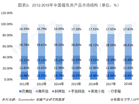 从具体产品来看,由于产品需求特性的影响,目前钱包手包在我国消费群体规模最大,在我国箱包市场中占比最高。根据Euromonito数据显示,2017年我国手包钱包市场规模为717亿元,占全国箱包行业市场规模的38.6%;近年来,居民收入水平提高下,我国居民出游次数和人数增多,带来了对行李箱的需求增长,2017年行李箱市场规模为328亿元,占比17.7%。2018年我国箱包市场规模稳步提升,前瞻测算,手包钱包占比约为38.4%,行李箱占比约为17.8%。