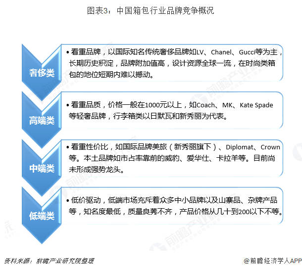 箱包行业可分为奢侈、高端、中端及大众。前我国箱包行业企业整体较多,行业进入门槛相对较低,行业内中小企业数量较多,造成我国箱包行业两级分化严重,奢侈、高端品线被国外品牌牢牢占据,中端市场由国外品牌与国内领先品牌竞争,大众市场系众多国内中小品牌。