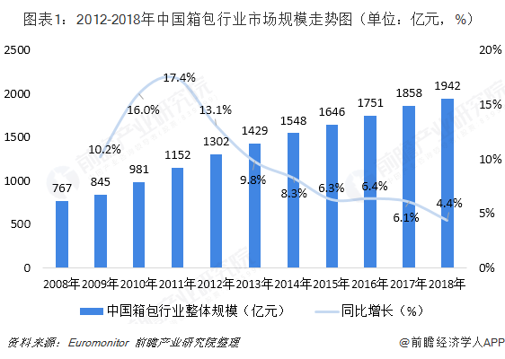 根据Euromonitor统计,2008-2017年我国箱包行业市场规模由767亿元增加至1858亿元,CAGR为10.4%,增速领先于全球5.4%的平均水平。2018年受全国宏观经济下行压力加大,GDP增速下滑的影响,前瞻测算,2018年,中国箱包行业市场规模为约为1942亿元,同比增长4.4%,增速较2017年有所下降。