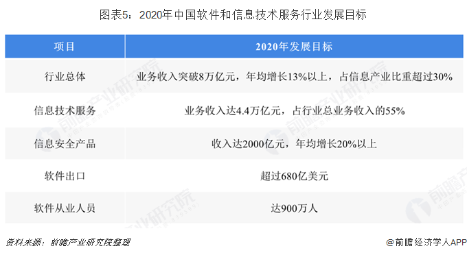 根据《软件和信息技术服务业发展规划(2016-2020年)》,到2020年我国软件和信息技术服务业业务收入将突破8万亿元,软件从业人员将达900万人。此外,规划对信息安全产品首次提出了发展目标,计划在“十三五”期间,我国软件和信息技术服务业的信息安全产品的营业收入达到2000亿元。