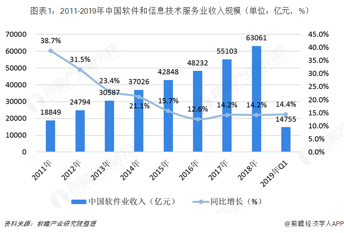2018年,我国软件和信息技术服务业总体保持平稳较快发展,行业规模进一步扩大。全国软件和信息技术服务业累计完成软件业务收入6.31万亿元,同比增长14.2%。2018年,我国软件和信息技术服务业收入占全国GDP比例上升至7.01%,在我国宏观经济增速放缓的趋势下,软件行业表现出较强的抗周期性,主要原因在于技术创新和迭代驱动下的行业高景气以及ZF政策推动下的信息化建设需求的提升。2019年以来,我国软件业也呈现出向好态势,在2019年第一季度,我国软件和信息技术服务业累计完成软件业务收入1.47万亿元,同比增长14.4%。