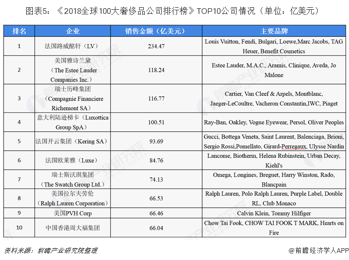 奢侈品行业集中度较高,销售额法国公司遥遥领先