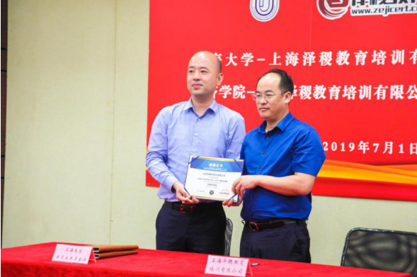 (泽稷网校讯)7月1日上午,上海大学与泽稷教育捐赠暨经济学院产学研合作签约仪式在宝山校区东区经管楼蔡冠深讲堂隆重举行。上海大学对外联络处副处长、上海大学教育发展基金会副秘书长曹俊,上海大学经济学院党委书记陆甦颖,党委副书记、常务副院长聂永有,副院长尹应凯,副院长毛雁冰,党委副书记贺利等院系领导,上海泽稷教育培训有限公司董事长蒋望、副总裁仝蕊蕊、区域总监王跃顺,参加了仪式。当天也是经济学院2018级本科生迎新典礼的一个组成部分,2018级全体本科生见证了本次上海大学与泽稷教育的签约。
