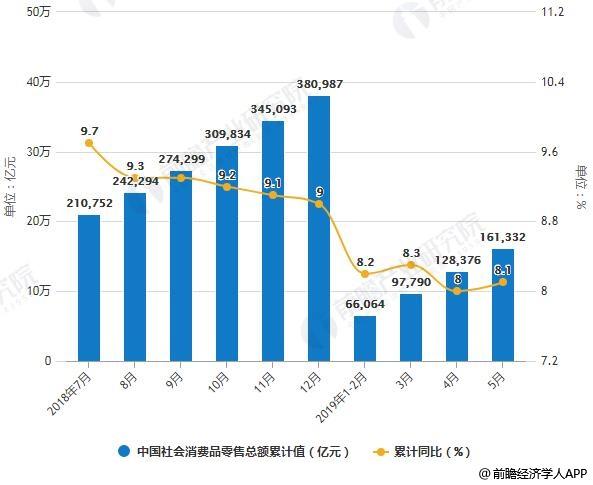 2019年1-5月中国社会消费品零售总额达到161332亿元,同比增长8.1%。其中,限额以上单位消费品零售额57924亿元,增长3.9%。