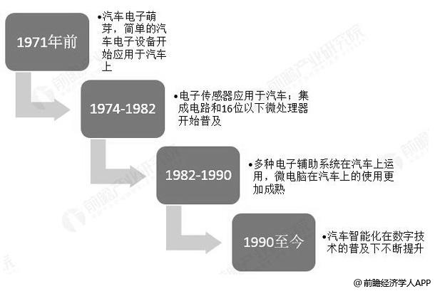 上世纪70年,汽车电子刚刚萌芽,汽车电子设备开始应用于汽车上。随后,便随着电子科学技术的不断迭代,汽车电子产业也飞速进步,历经了集成电路、多种电子辅助系统等多个阶段,发展至今。如今,数字技术普遍应用,汽车智能化进一步提升。