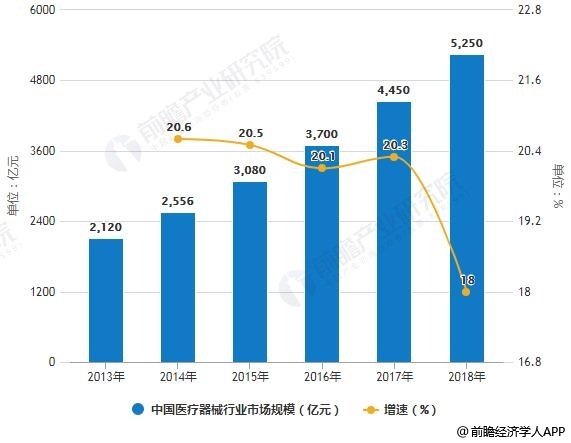 随着我国经济生活水平的不断提高,人们对医疗保健的意识逐渐增强,因此对于医疗器械产品的需求也在不断地攀升,再加上我国正逐步进入老龄化社会和国家政策层面上对行业的支持,使得我国医疗器械市场规模快速增长。据前瞻产业研究院发布的《中国医疗器械行业竞争格局与领先企业分析报告》统计数据显示,2013年中国医疗器械行业市场规模已达2120亿元,2015年中国医疗器械行业市场规模突破了3000亿元,截止至2017年中国医疗器械行业市场规模增长至4450亿元,同比增长23.3%。进入2018年中国医疗器械行业市场规模突破5000亿元,达到了5250亿元,同比增长18%。2013-2018年复合增长率为20%。