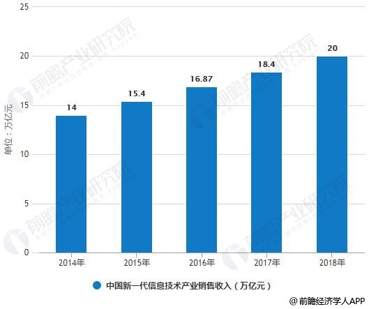 在市场规模方面,据前瞻产业研究院发布的《中国新一代信息技术产业发展前景预测与投资战略规划分析报告》统计数据显示,2014年中国新一代信息技术产业销售收入约为14万亿元,2015年中国新一代信息技术产业销售收入达到15.4万亿元,同比增长10.4%。截止至2017年中国新一代信息技术产业销售收入增长至约18.4万亿元,初步测算2018年中国新一代信息技术产业销售收入将达到了20万亿元左右。