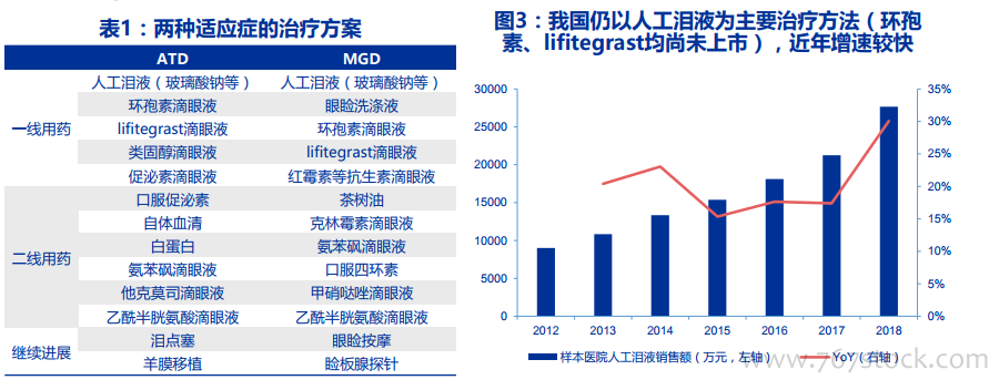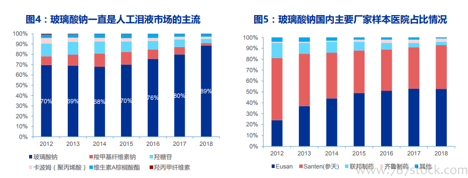 干眼症用药:人工泪液。我国目前针对干眼症的疗法主要还是使用人工泪液,诸如羟丙基甲基纤维素钠滴眼液、聚丙烯酸凝胶等。玻璃酸钠(又名透明质酸钠)是目前市面上人工泪液最常用的成分,因为其成分与人体相容性好,而且越来越多的产品都实现了不添加防腐剂(防腐剂会加重眼表和泪膜的损伤),因此市占率呈逐年上升的趋势。