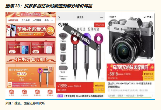 拼多多 618 整体状况:腹背受敌。根据拼多多公布的 618 整体数据,截至 6 月 18 日晚间 19:40,拼多多平台在 618 期间订单数突破 10.8 亿笔,GMV 同比增长超过 300%;我们认为基于今年 618 各平台对下沉市场的强力渗透以及平台间的恶性竞争(阿里二选一 + 重启聚划算、京东低线用户大力度促销活动等),拼多多本次 618 表现难以称得上非常出彩。拼多多本次 GMV 增量除下沉市场外,开辟了一种简单直接的大促形式:通过百亿补贴大牌产品(苹果、索尼、戴森、BOSE、SKII 神仙水等),对品牌特定 SKU 做直降,吸引了不少一二线用户薅羊毛和种草。