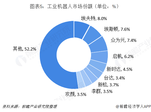 对比不同国内厂商的销售情况,市场表现较好的国内厂商分别是埃夫特、埃斯顿、众为兴、广州启帆、新松和新时达,相较其他本土厂商,这些厂商起步较早,目前都已具备一定规模和技术实力。TOP9占据近50%市场份额,行业集中度高。