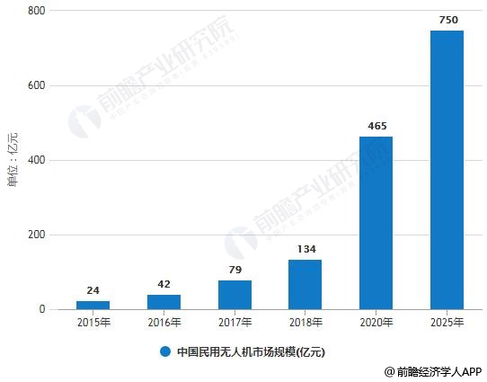 2015年,我国无人机在各个领域开始了大规模的拓展,被称为“无人机元年”,中国民用无人机市场规模达到了24亿元。随着无人机应用领域的逐渐扩大,无人机市场需求逐渐提升,预计有望在2018年突破100亿元大关,市场规模达到134亿元。业内产业评估机构预计,2020年我国民用无人机产品销售和服务的总体市场规模将达到465亿元,2025年将达750亿元,未来市场容量十分可观。