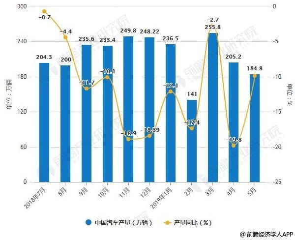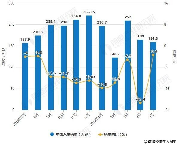 当前,中国车市进入深度调整期,处于市场转型的关键节点。据前瞻产业研究院发布的《中国汽车整车制造行业需求前景预测与投资战略规划分析报告》统计数据显示,2018年全年中国汽车产销量分别达到了2780.9万辆和2808.1万辆,与2017年相比,同期分别下降4.2%和2.8%。截止至2019年5月中国汽车产销同比降幅有所扩大,产销量分别为184.8万辆和191.3万辆,比上月分别下降9.9%和3.4%,比上年同期分别下降21.2%和16.4%,同比降幅比上月分别扩大6.7和1.8个百分点。