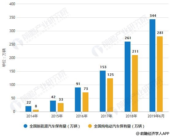 值得一提的是,截至2019年6月全国新能源汽车保有量达344万辆,占汽车总量的1.37%,与2018年底相比增加83万辆,增长31.87%,同比增加145万辆,增长72.85%。其中,纯电动汽车保有量281万辆,占新能源汽车总量的81.74%。