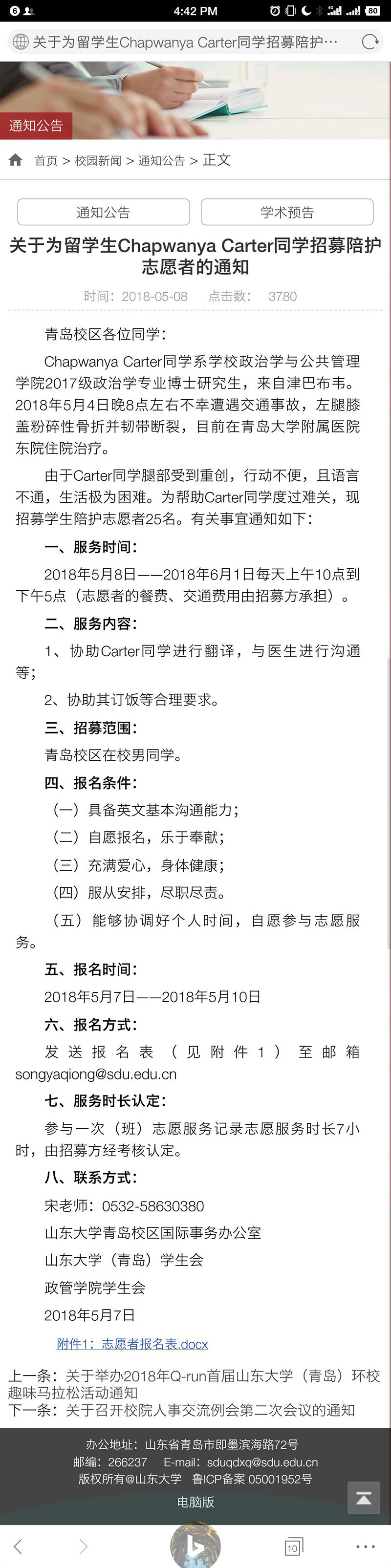 山东大学曾招募25人陪护一名骨折留学生, 相关网页已被删除http://news.uc.cn/a_10626978009234859202/?from=UCPC