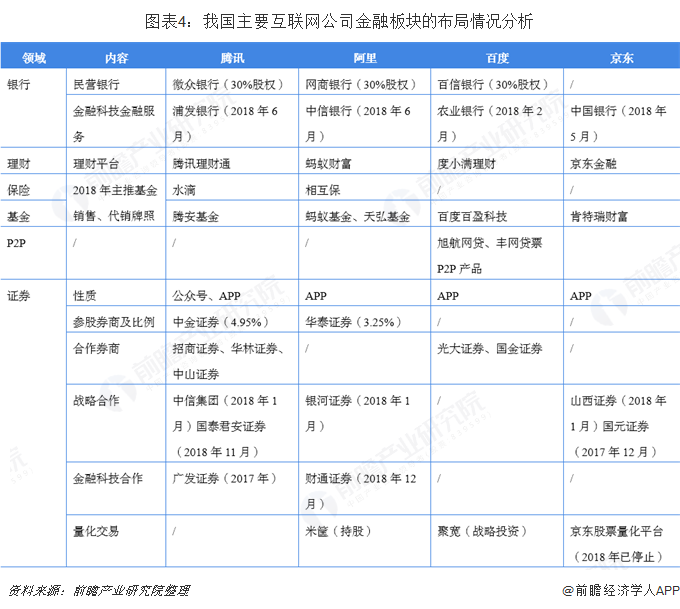 从行业新进企业布局情况来看,2018年,互联网企业无论是在银行、证券、保险,还是在国际金融布局当中,都有着前所未有的进展。这些互联网企业在互金行业破旧立新过程中,有的在不断布局,有的却在退出出清业务,在出清的业务当中,最为明显的是京东金融在2018年12月宣布京东量化交易平台关闭,然而,更多的则是各家互联网企业在证券、保险,甚至是P2P领域的布局。