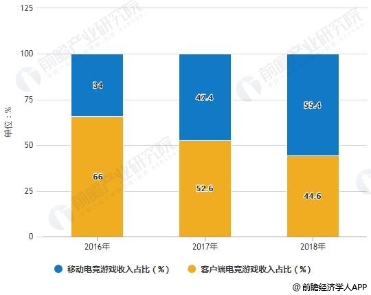 具体分析我国电竞游戏收入结构,2016-2018年,我国移动电竞游戏市场规模不断扩大,移动电竞游戏销售收入占整体收入的份额从2016年的34%上升至2018年的55.4%,首次超过了客户端电竞游戏收入,主要得益于《王者荣耀》等移动电竞游戏产品的发展。目前,电竞游戏收入依然会占据着我国电竞收入的主要地位,但是随着我国电竞游戏用户规模逐渐饱和,失去人口红利以及市场未出现新的头部电竞游戏,预计我国电竞游戏收入的增速继续减缓,但移动电竞将作为电竞游戏的主要增长引擎带动我国电竞市场发展,成为最大的电竞市场内细分市场。