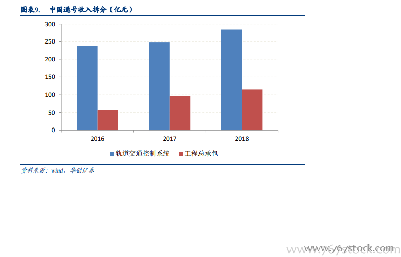 公司的主营业务包括轨道交通控制系统与相关领域的工程承包。公司 2016/2017/2018 年主营业务收入分别为297.7/345.9/400.1 亿元,三年年化复合增长率为 15.93%。其中,轨道交通控制系统 2016/2017/2018 年的销售收入分别为 237.69/247.41/284.22 亿元,占主营业务收入的比重为 79.84%/71.54%/71.03%,且毛利率较高,其中 2018 年的设计集成业务毛利率为 35.12%,设备制造业务 43.18%,系统交付业务 12.34%,是公司重要的收入来源。随着收入的增长,公司利润也在稳定上升,2016/2017/2018 年的净利润分别为 30.49/33.10/35.01 亿元,三年年化复合增长率为轨道交通控制系统业务科进一步拆分为设计集成、设备制造和系统交付三部分。其中,设计集成部分 2018 年收入85.63 亿元,占轨交控制系统收入的 30%,设备制造收入 66.28 亿元,占比 23%,系统交付 132.31 亿元,占比 47%。工程总承包方面,市政及相关工程收入最多,2018 年达到 109.75 亿元,占工程总承包收入的 95%以上;有轨电车与智慧城市属于新兴领域,目前销售收入较低,但未来有着巨大的发展潜力。