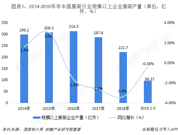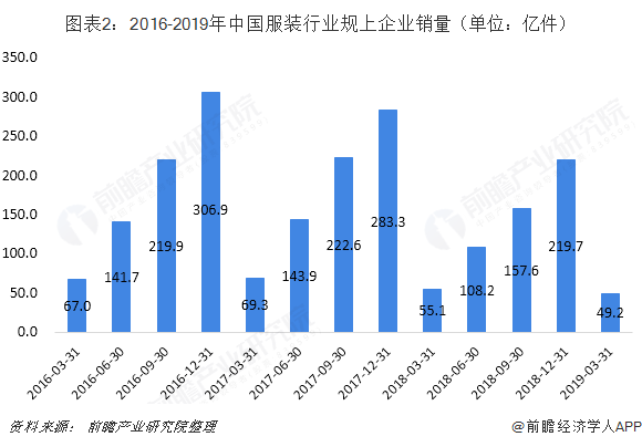 最新数据显示,2019年第一季度我国服装行业规上企业销量49.2亿件,同期规上企业服装产量48.88亿件,产销率突破100%,达到100.7%。