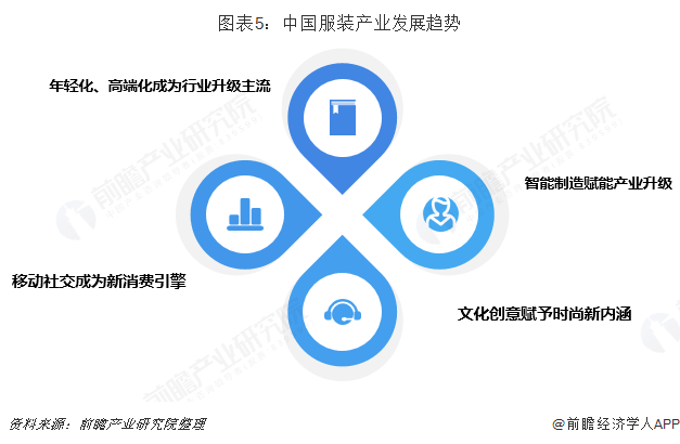 随着消费升级,国内90、00后消费群体崛起,服装行业个性化、差异化的诉求将会更加强烈,年轻化、高端化将成为行业转型升级的主流趋势;新一轮科技革命下,大数据、云计算及人工智能的发展带来了深刻的变革,智能化网络化成为技术和产业升级的重要方向,服装行业将深化各高新技术在生产营销等关键环节的应用,提升生产与消费服务能力;电商刺激下,移动社交既可以刺激用户消费需求,同时有助于产品通过社交平台的信息共享形成品牌传播,满足消费者的个性化需求;同时,消费者在对产品质量和品牌的要求提高下,对于服装所体现的文化创意更加注重,文化创意也将赋予服装新的时尚内涵。
