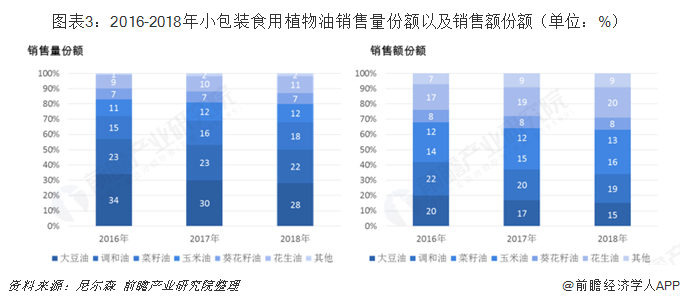 按照包装方式划分,食用植物油可分为散装油、中包装食用油以及小包装食用油。近年来,随着国家关于限制散装油销售相关法规的不断出台、居民生活水平的提升以及消费者日益提高的食品安全意识,散装油消费量逐渐减少,中小包装食用油消费量逐渐上升,占据着食用油市场的主要地位。小包装食用植物油按照细分油种可以分为大豆油、调和油、菜籽油、玉米油、葵花籽油、花生油等品类。从销售量来看,销售价格相对便宜的油种,如大豆油、食用调和油、菜籽油等依然占据小包装食用植物油的主要部分,销售量占比超过80%。从销售额来看,销售价格相对较高的花生油占比最高,2018 年销售额占比超过20%。
