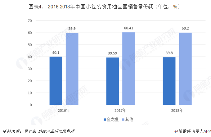 金龙鱼中国小包装食用植物油行业占据领先的市场份额。根据尼尔森数据,按销售量统计,公司2016 年、2017 年及2018 年的销售份额分别为40.1%、39.5%及39.8%,均领先于竞争对手。我国小包装食用植物油销售份额具体情况如下图所示:
