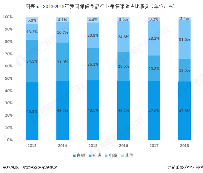 根据欧睿咨询统计数据,2013-2018年直销渠道一直是各大保健食品生产商销售产品的主要渠道,每年该渠道的销售占比均在47%左右;其次是药店渠道,近几年的销售份额占比也均维持在18%以上;随着移动互联网与电子商务在国内的快速发展,保健食品行业的电商销售去道占比也逐年提升,2018年该渠道的保健食品销售份额占比达到31.6%。