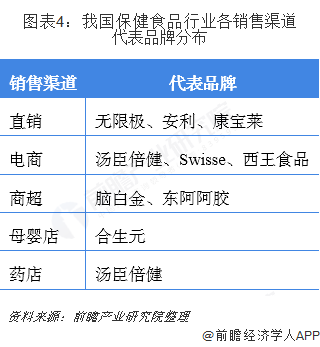 目前我国保健食品行业中的企业销售产品主要通过直销、电商、商超、药店等渠道,其中通过直销渠道销售产品的代表品牌有无限极、安利和康宝莱;而采取电商渠道的品牌有汤臣倍健、西王食品等。
